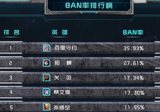 在英雄ban率上,百里守约稳占第一位,超远距离的狙击以及视野装置已经高超鲁班的鲨嘴炮恶心程度。貂蝉虽然bug众多,不过还是有许多高手能秀的对面找不到北。关羽无限撞人以及团战时的超强控场效果最近也是让不少玩家头疼。蔡文姬已经连续多个赛季常坐ban位。孙悟空的无脑爆发三棍后期让不少脆皮玩家心疼爆炸,不过这里也有一部分是禁队友的逗比猴吧。