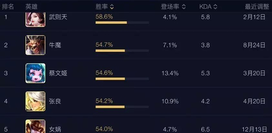 胜率最高的英雄前五名分别时武则天、牛魔、蔡文姬、张良、女娲。干将的输出虽然高,但是胜率只排英雄中39位,刚好是五五对半开的胜率。武则天作为土豪英雄,胜率一直保持碾压首位,而牛魔和蔡文姬有较强的辅助能力,打团控场较强,所以胜率比较高。张良在重做后并且经历一次大加强,真实伤害非常恐怖,而且二技能的防守能力非常高。女娲则是排到了第五,在后期的输出和团战切割战场能力不错。