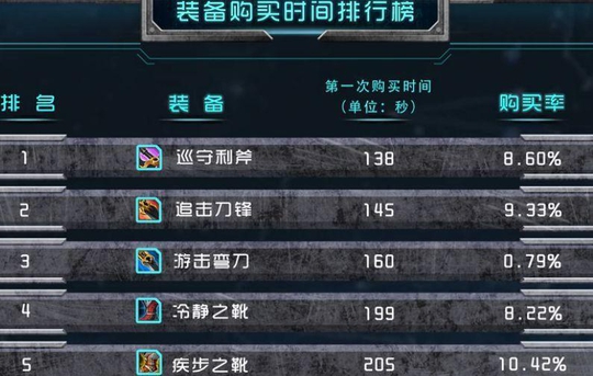 最后时装备合成的购买时间排行,打野三件套是最快入手的装备,毕竟打野前期只要不被反野,肯定是能抢先合成,并且沿用整局比赛。第四名则是售价较低的冷静之靴,中路法师都偏爱冷却鞋子。第五名则是辅助喜欢的疾步之靴,虽然售价最低,但是辅助的前期经济涨幅还是比较慢。