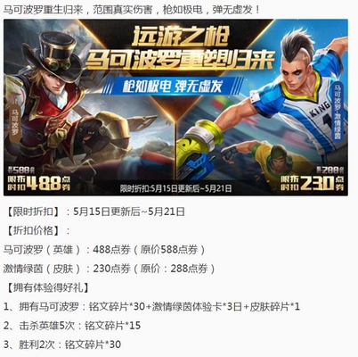 5月15日更新后,王者荣耀首个带有真实伤害的射手重生归来!马可波罗带着优化后的皮肤上线正式服后,英雄点券售价直降100,伴生皮肤随之降价到230点券!