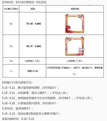 5月15日更新会,召唤师累计登陆游戏、参与对战、使用指定英雄参与1V1对局、分享指定图片、添加任意一款皮肤到心愿单都可以获得520爱心巧克力。5月22日前召唤师集满52个520爱心巧克力即可兑换周小瑜、萌小乔两款头像框中的一个!