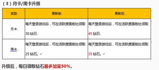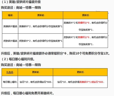 5月15日更新后,英雄/皮肤碎片福袋、每日暖心福利、月卡/周卡全面升级!具体升级内容小伙伴可查看上表。