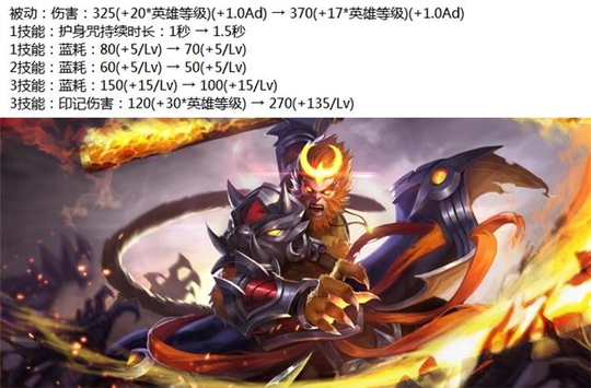 孙悟空大增:被动和大招的前期伤害大增,蓝量续航更强,1技能抵挡技能的时间延长0.5秒。