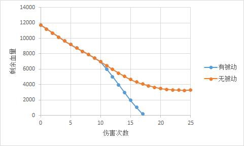 可以看到,由于被动的存在,在10发子弹后,夏侯惇的血量急剧下降。而假设是无被动的情况下,输出效率会越来越低。