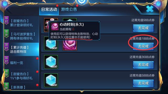 除了调整七个英雄,这次更新还上线了很多活动,比如累计充值1888点券送永久的击败特效。