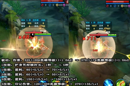 孙悟空前期能力大幅度提升,大招的标记伤害提高非常多,四级时的一套攻击提升了三四百点。被动基础值前期提高,后期的伤害一致。三个技能蓝耗全部降低,一技能护身持续时间提高,触发难度降低,相当于护盾的持续时间也被延长。