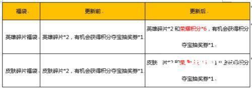 升级后,英雄/皮肤碎片福袋额外必得荣耀积分*6,购买10个可免费积分夺宝1次。