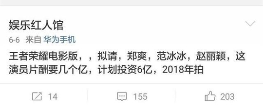 其实这两年,网上就传出很多《王者荣耀》的电影计划。比如去年6月份,说王者荣耀电影计划投资6亿,拟请郑爽、范冰冰、赵丽颖等。