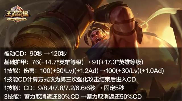 苏烈这次主要削弱了1技能伤害及大招CD,提升了苏烈的基础护甲,怪客觉得苏烈虽然被削了一些,但还是很强势,作为一个两条命的男人,虽然伤害被削弱了,但护基础甲增强了: