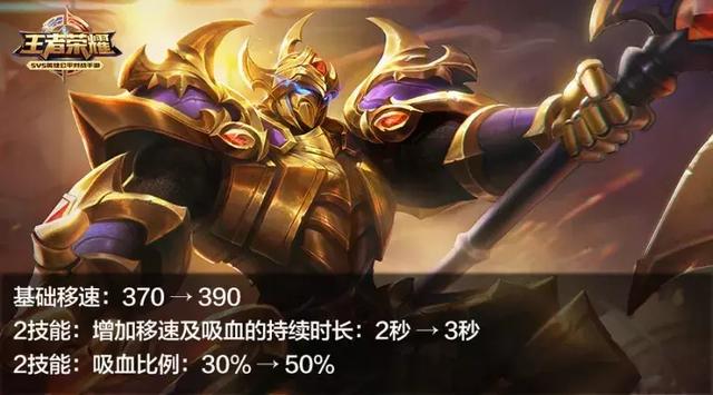 解析:典韦虽然拥有短CD的加速技能,也不能弥补他基础移速过慢的缺陷,所以这次上调他的基础移动速度,及2技能的持续时间和吸血比例做一些调整。