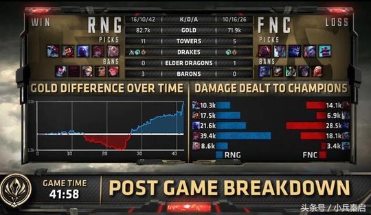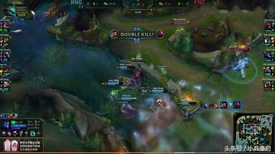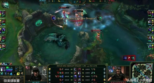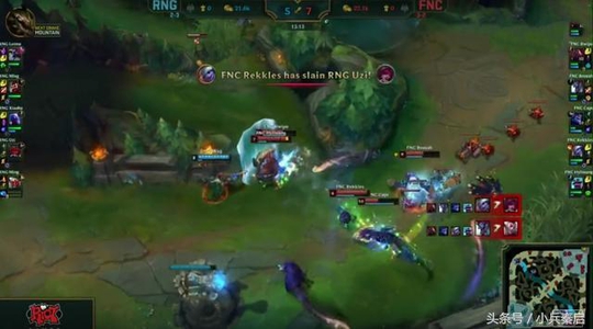 比赛来到第十三分钟,塞恩传送下路FNC五人抱团将RNG下路和打野击杀,趁势拿下所有外塔,并在第十八分钟拔掉上路二塔,RNG陷入视野盲区,瑞兹0/3的战绩发育不起来 ,而龙王却4/0节奏带得飞起,而比赛的转折点是中期一波团战。