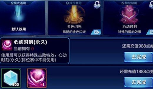 今天的活动,其实还有一个亮点,不知道大家有没有注意到。王者荣耀第二个击败特效今天上线了,目前只有两款不同的击败特效。而这款心动时刻,能够通过充值点券来获得,而且是永久的哦。从特效上来看的话,这款击败特效还算不错,平民慎重,土豪随意。毕竟这1888点券,对于土豪来说,只不过一款传说级别的皮肤而已。
