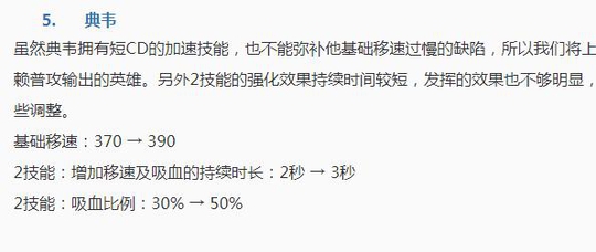 而在这次改动内容中,典韦获得了高额加强不仅对移速进行了加强,就连二技能的持续时间也获得了加强,最强大的一点就是吸血比例从百分之三十直接提升到百分之五十,可以说典韦作为这次改动中的受益者,甚至在以后游戏中可以经常看到典韦的霸气身姿。