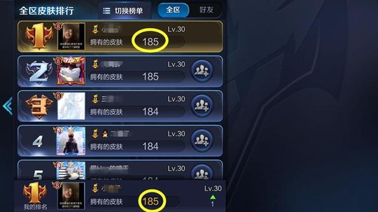 因为这位土豪玩家,已经拥有185款皮肤了,这是个什么概念?185款皮肤,其实就是我们所说的全皮肤了,尽管现在王者荣耀有187款皮肤,但有些皮肤还是没办法得到的。我们可以看到,这位土豪玩家拥有185款皮肤,已经是全区第一的了。既然这样的话,添加一款还没有的皮肤上去,应该很容易才对的,毕竟还有2款皮肤还没有获得。