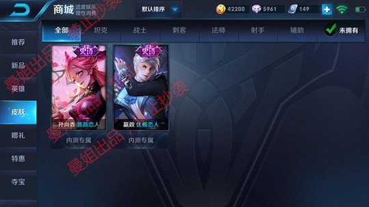 但是,这位玩家想参加天美却不让,因为这两款没有的皮肤都是内测皮肤。我们知道,内测皮肤是不能够添加到心愿单的,因为商城没有直售。所以,这位土豪玩家想参加这个皮肤心愿单活动,是永远不可能完成的,因为自己已经满皮肤了。终于,小曼感到很欣慰,做了一件连土豪都没法完成的事情,感觉美滋滋有木有?