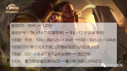 第四位是苏烈,最大的削弱就是复活CD由90秒增加到120秒,1技能伤害降低,CD的计算方式也改为3次强化普攻结束进入CD,由以前的9→6秒,改为固定5秒。