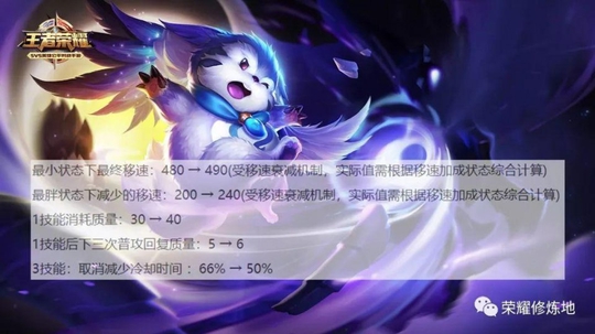 然后是梦奇,最小状态下移速提升,最胖状态下移速降低,让梦奇移速改变这一特色玩法更加明显。另外,释放1技能消耗的质量也有所提升。