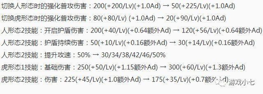 裴擒虎在切换人形状态时的强化普攻伤害太高了,直接从200点削到50点,可以说天美是真够下狠手的,切换到虎形状态下时的强化普攻也从80点削到了20点,反正就是大招切换2种状态(虎形、人形),削废了。其中也包括人形下的2技能,护盾、持续伤害、攻速等全面削,虎形下1技能伤害略微提升,2技能伤害反倒是砍了一刀。