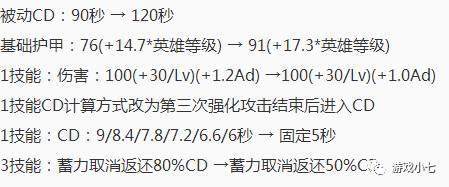 苏烈,被动的复活甲增加了30秒时间,太嚣张无脑的冲是要被砍的,自身基础护甲加强了很多,1技能伤害忽略不计的削弱了点,1技能CD加强了,改为固定5秒,3技能蓄力又取消,返还CD,降低了30%的CD。