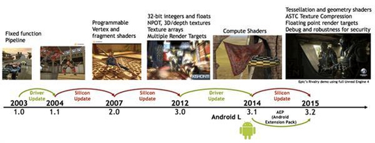 而且使用了新版的着色语言,增强了纹理功能;而3.1版本中支持通用计算着色器、3.2版本中支持新的ASTC纹理格式等改进,也都大大拓展了OpenGL ES的应用范畴,提升了效率。