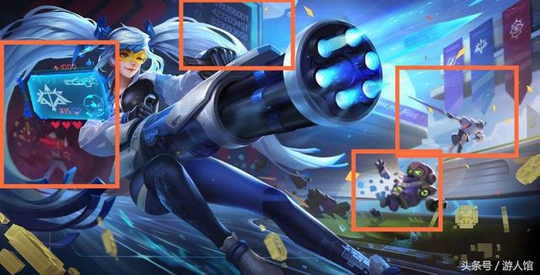 从这个皮肤可以看到孙尚香还是双马尾的标志,不过整个色调变成了蓝色,手上的枪,感觉也是高科技的风范。官方还让大家来找一找这个海报中的一些彩蛋,你们找到些什么了。