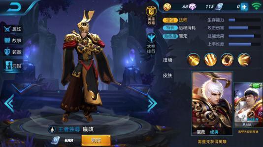 同样是一位稀有英雄,需要点券购买,无法使用金币和碎片兑换,虽然嬴政没有位移和加速技能,可是他的攻击范围非常广,特别是大招,除了全图技能,基本就属他的最长了。