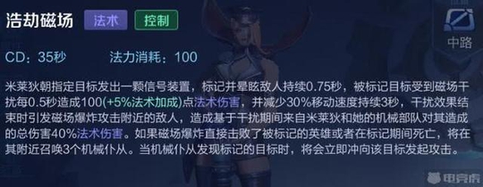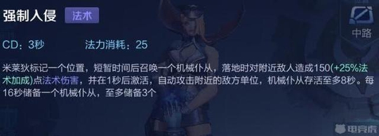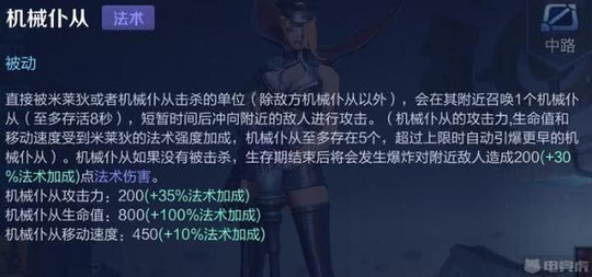 米莱狄的被动技能是将击杀的敌方单位变成自己的机械仆从,而二技能是自己召唤一个机械仆从出来。这个机械仆从最多存活八秒,在生命值方面有着100%的法术加成,所以一个纯输出的米莱狄所召唤仆从的血量也很可观。当集齐了五个仆从一起进行推塔时也极具视觉效果。