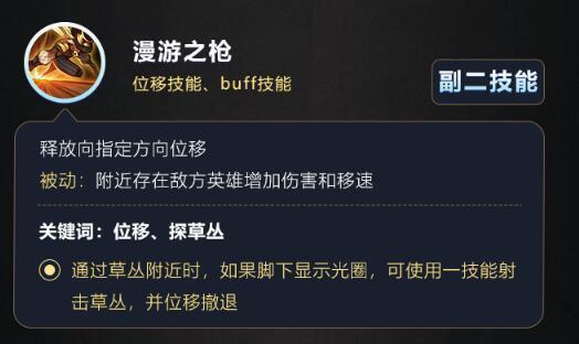 二技能跟之前相比的话就只有一个位移了,不过就是在草丛附近的时候就能出现一个圈,证明草丛有人,你打波消耗就能直接撤退了。