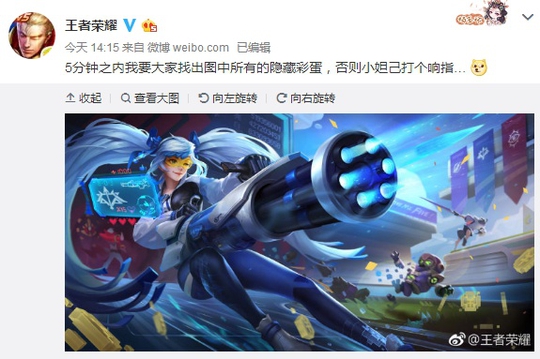 不就是找五分钟内找彩蛋吗?想当初为了看《复仇者联盟3:无限战争》的彩蛋,我们何止花了五分钟!但正所谓擒贼先擒王,像这种送分题岂不是手到擒来?这最大的彩蛋可不就是这科技感十足的孙尚香新皮肤吗???