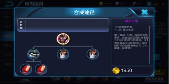 暴烈之甲这件装备一度是战士坦克玩家们的最爱,遭到削弱后也仍然出场率不低。其基础属性为:+220物理防御,+1000最大生命值。虽然基础属性不是十分的亮眼,但是暴烈之甲的唯一被动-无畏却是很不错:每次受到伤害后,提升2%的伤害和移速,最高能提升%10的伤害和移速,持续3秒。这个被动技能在面对持续输出型英雄尤其是射手英雄时具有非常好的效果,合成途径也非常平滑,是个不错的装备。