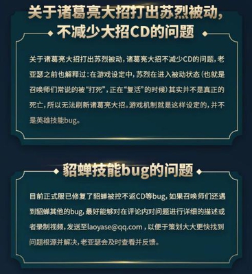 而对于被网友重复提及的貂蝉BUG,官方的态度是已经修复完毕了。如果网友还有找到其他BUG,可以继续反馈。