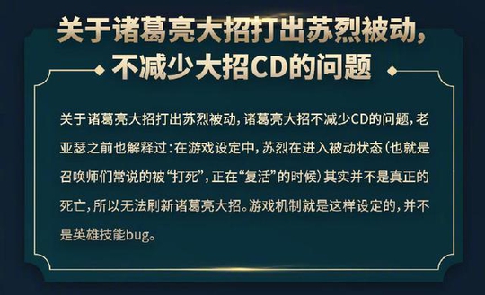 诸葛亮大招在几个月前就被修复,大招打出苏烈被动,并不意味着苏烈被击杀,所以大招才不减CD。这也是一件很尴尬的事情,在打团过程中,苏烈一旦残血,诸葛亮这是放大呢?还是不放大呢?