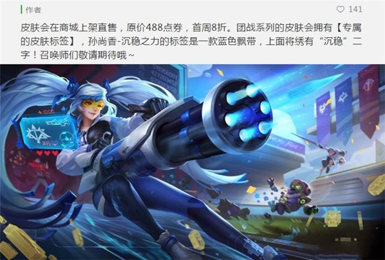 王者荣耀:孙尚香新皮肤售价已定,下周二上架商城8折出售