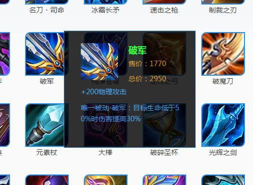 NO3、破军:破军自然不用提了,敌人生命值低于50%的时候,输出伤害直接提升30%。当然,破军的200点物理攻击力也是在哪里放着的。这可是最强的收割神装,像阿轲、猴子等这些爆发收割型刺客必出的核心装。甚至很多战士坦克英雄在大后期的时候都会选择出破军。