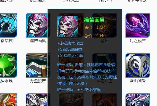 NO4、痛苦面具:痛苦面具是一件ap收割装,它的加成属性非常全面,法攻、法穿、冷却、最大生命值等都有加成。而最让痛苦面具有收割力的还是它的唯一被动:技能伤害会对敌人造成额外的当前生命值百分比的伤害,这和末世是一样的效果啊,只不过面具的是技能伤,而末世是平A伤。不管是什么形式的攻击,但对于貂蝉,诸葛亮等这些收割型的法师,这可是他们必出的一件核心收割装啊!