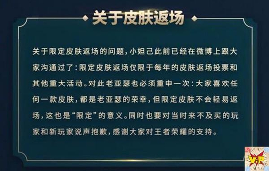 今年进行的520活动,并没有限定皮肤返场,这倒是让玩家们感觉到有点诧异。而官方在今天也回应了这个问题:限定皮肤返场仅限于每年的皮肤返场投票和其他重大活动,所以限定皮肤不会轻易返场,这也是限定的意义。而使者依然记得,在去年的520活动上,纯白花嫁和真爱至上返场了。在去年就是重大活动,到了今年就不是了吗?官方既然提到了限定的意义,那么既然是限定皮肤,就不应该拿出来返场。就像去年的纯白花嫁和真爱至上,返场之后基本上是泛滥了。而现在依然要求返场这2款皮肤的玩家,大部分是去年没有买到或者是之后入坑的。