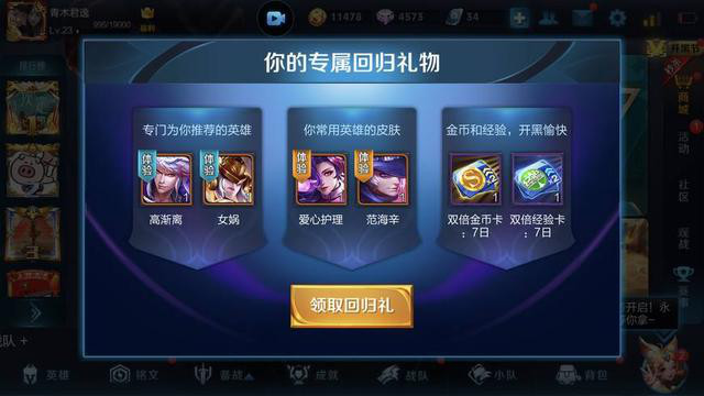 正因为英雄的价格昂贵,便宜的又不好玩,导致很多玩家攒金币的速度远远比不上官方出英雄的速度,小伙伴一步没跟紧,步步也就没跟紧之下就一言不合就退游,可王者荣耀堪比毒瘾,哪能说戒就戒,就在很多玩家又回归的时候惊喜的发现,原来玩家回归的礼物这么丰厚。