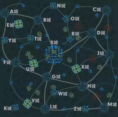从地图上,我们可以看出,共有26个城市,和常见的吃鸡地图一样城市有大有小,其中,最中心的S城是最大,也是吃鸡的关键地点。
