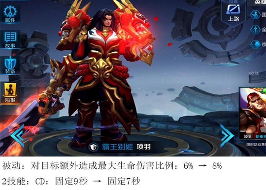 项羽大幅度增强,被动效果的伤害百分比调整至刚重做时的8%,输出消耗能力提升。二技能的全等级冷却时间降低两秒,可以更频繁的削弱敌方的伤害输出,控制能力提升。