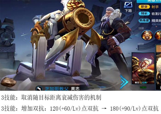黄忠的加强大招,使大招不会再因为敌方靠近而削弱伤害,就算贴脸攻击也是翻倍伤害,不过炮击边缘的伤害削弱还是有,另外提升了双抗加成,满级提供360的双抗效果,与吕布法阵加成一致。