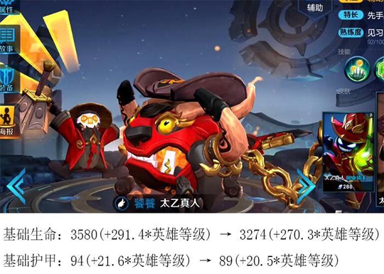 太乙真人的削弱比较小,主要是生存能力降低,前期开着一技能无限控人太过强势,降低了大约六百点的基础生命值,防御力也削弱了二十点。