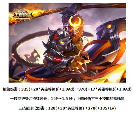 提升了孙悟空被动强化普攻和大招前期的伤害,更值得注意的是一技能的护身咒时长增加了0.5秒。