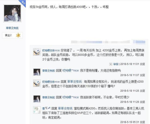 然而女玩家就找各路大神帮忙,还说明自己现在的情况,自己目前只有5K金币,而且系统规定每周最多只能4K金币,玩家充满了疑问,就问网友这可怎么办?这时候有良心好友直接告诉玩家,每周上线4200金币,贵族奖励,战队奖励这里就有8000+金币了,而且还可以用金币卡增加金币数量.还有各种办法,只是复杂了一点,看来各路大神都厉害.