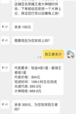 这不有一位女玩家小姐姐,就找到了某宝一个代练组织,想让其从铂金5给她代练到星耀3,代练也是马上给出了需要的价格,一看真的是不低啊。要知道一位稍微厉害点的代练一两天就能够把一个普通号上升到王者的段位,因为很多网络主播都曾经在赛季重新开始的时候一天上到王者!这根本不是开玩笑的,这位小姐姐也是欣然的接受了,因为段位高了能够在朋友圈里面炫耀吧!
