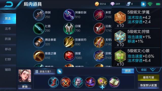 因为她技能机制的原因,所以在前期要出一件很冷门的装备,那就是巫术法杖,在释放一技能后跟随一下普攻是能给敌人造成很大伤害的,之后就补上面具和帽子,这样在中期的时候没有哪个敌人愿意被你白白消耗!最后补上辉月和贤者之书,前者具有很强的保命能力,后者增加大量伤害!铭文则推荐梦魇+狩猎+心眼!