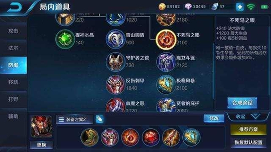 第三件,魔抗装备,首推不死鸟,这个不用多说了,回血杠杠的。假如对线期是法师类型,不死鸟可以适当考虑第一件出。但是如果敌方法师爆发或控制居多,建议出魔女斗篷,不会给你太多回血机会。