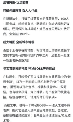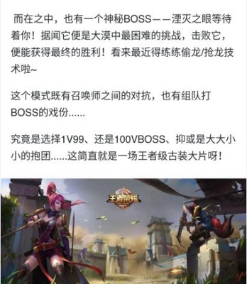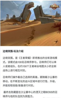 《王者荣耀》官方微博近日公布了新玩法“边境突围”,该模式由100名召唤师参与,玩家可以单人或者组队,在约150个王者峡谷地图大小的全新战场上进行相互对抗。沙尘暴会从外围逐渐覆盖全图,英雄处于沙尘暴中会掉血,需要往中心城靠拢,玩家需要在不断变化的战斗区域中进行打怪、升级,并能拾取技能/装备进行对抗。另外,官方还说明此模式中将会有神秘BOSS“湮灭之眼”,最终击败藏匿在沙尘暴中心的BOSS的召唤师与他的队伍则为获胜方。