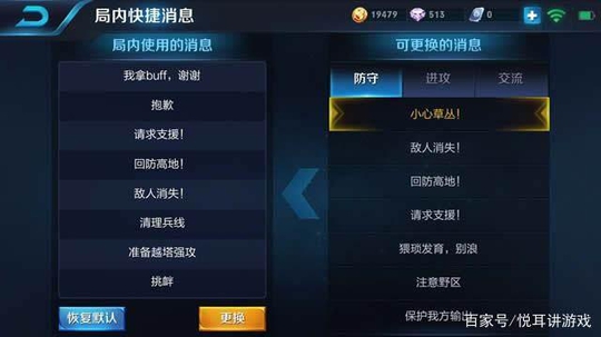 按第二点的已经关闭了局内打字,这时候就非常需要信号来提醒队友了。除了局内必有的“进攻”,“集合”,“撤退”等,悦耳还推荐大家去设置下局内快捷消息,例如“敌人消失”,“准备越塔强攻”,“我来抓人了”等信号,让敌人第一时间知道你的意图,从而配合你打出完美团战。比如越塔,你不发信号队友可能都不知道你要干嘛,你发完信号,队友就能配合你去越塔击杀,否则你一个人越塔,敌人没杀死,自己还送出一血不就悲剧了吗?