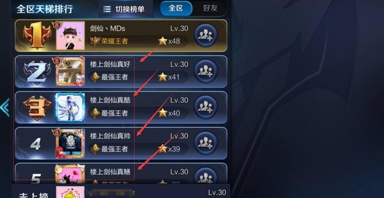 然而排在大西瓜后面的这个第二名的游戏玩家,这个ID看上去就有点亮眼了。这个玩家的游戏ID是这样子的:楼上剑仙真好。然后是第三名,一个王者40星的游戏玩家,他的游戏ID叫做楼上剑仙真酷。还有第四名,是叫做楼上剑仙真帅,第五名则是叫做楼上剑仙真鳝。不得不说,该区服排名已被“西瓜大军”霸占了。