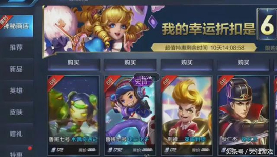 首先账号是必须要是没有开启过折扣的,进入商城主页面之后不急着点击折扣抽取。相反地,看到右边的三个选项烂,每个选项栏从上到下各点击刷新一遍,每一次要有短暂停留。这些做完以后回到神秘商店里边再去点开抽取神秘商店的折扣,这个时候能够抽取到的折扣就基本上都是五折。而且还有非常大的几率出稀有的物品,比如武则天的皮肤好嬴政这个英雄。